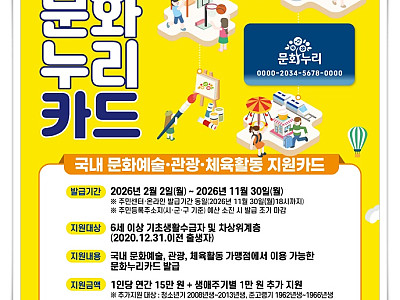 2026년부터 문화누리카드 지원금 인상…일부 연령대 최대 16만 원 지원... 청년문화예술패스 대상·금액·사용 범위 확대해 청년 문화 향유... 태백시가 2026년부터 문화누리카드와 청년문화예술패스 지원을 확대하며 문화 취약계층과 청년의 문화 접근성을 한층 끌어올렸다. 태백시(시장 이상호)는 2026년부터 문화누리카드와 청년문화예술패스 지원을 확대 시행해 …