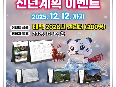 공식 SNS 구독 후 참여…추첨 통해 2026년 태백 달력 제공... 2030세대 포함 전 세대 소통 확대…관광·시정 홍보 효과 기대... 2025년 1월 12일 작성. 태백시가 시민과 관광객을 대상으로 SNS를 활용한 참여형 이벤트를 마련하며 시정 소통 강화에 나섰다. 태백시는 12일까지 시민과 관광객을 대상으로 ‘2026년 신년계획 SNS 구독 이벤트’…