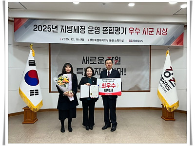 강원특별자치도 평가서 부과·징수부터 체납 관리까지 고른 성과... 납세자 편의 행정 강화로 공정하고 효율적인 세정 운영 입증... 태백시가 지방세 행정 전반에서 안정성과 효율성을 동시에 인정받으며 2년 연속 최고 성과를 거뒀다. 태백시(시장 이상호)는 강원특별자치도가 실시한 ‘2025년 지방세정 운영 종합평가’에서 2년 연속 최우수 시·군으로 선정됐다고 밝…