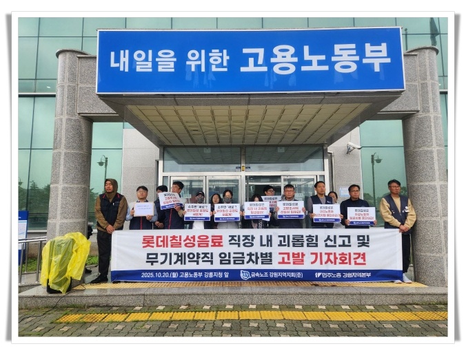 이날 금속노조와 민주노총 강원지역본부는 롯데칠성 원주공장 앞에서 기자회견을 열고, 무기계약직 여성노동자들이 오랜 기간 부당한 처우와 직장 내 괴롭힘에 시달리고 있다고 폭로했다.