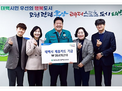 3,947만 원 적립… 지역 인재 육성 장학기금으로 활용... 태백시(시장 이상호)는 지난 3일NH농협은행태백시지부(지부장 이미선)와 함께 2025년분 제휴카드 적립기금 39,476,210원에 대한 전달식을 개최했다고 밝혔다. 제휴카드 적립기금은 NH농협은행과의 업무협약에 따라 시에서 사용한 보조금카드, 태백사랑카드, 시청기업카드, 공무원복지카드 이용 금액…