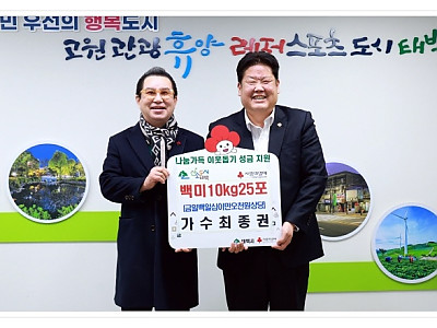 백미 10kg 25포 전달했다…강원공동모금회 통해 지원... “작은 정성이 누군가에게 힘 되길 바랐다”고 밝혀... 연이은 나눔 실천이 지역사회에 온기를 더하고 있다. 태백시(시장 이상호)는 지난 2일 가수 최종권 씨가 태백시청을 방문해 관내 저소득가구를 위해 백미 10kg 25포를 기탁했다고 밝혔다. 이번 기탁은 지난해에 이어 두 번째로, 꾸준한 나눔 실…