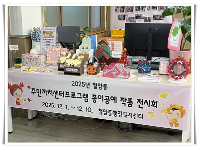 12월 1~10일 수강생 종이공예 작품 15점 공개... 7개 주민자치 프로그램 운영… 96명 참여하며 지역 문화 기반 넓혀... 2025년 12월 1일 작성.철암동행정복지센터가 2025년 하반기 주민자치 프로그램의 성과를 시민과 공유하기 위해 종이공예 작품 전시회를 열었다. 이번 전시는 주민자치센터 프로그램에 참여한 수강생들이 직접 만든 종이공예 작품을 …