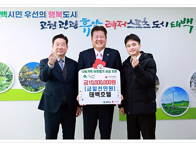 취약계층 생활안정 위한 연말 기부 실천... 강원공동모금회 통해 관내 가구 지원에 사용 예정... 2025년 12월 10일 작성. 태백시가 지역 내 취약계층 생활안정을 돕기 위한 민간 기부가 이어지면서 연말 복지 지원 체계가 한층 강화됐다. 태백시는 태백호텔(대표 이용철)이 9일 관내 저소득 가구와 소외계층 지원을 위해 성금 1,000만 원을 기부했다고 밝…