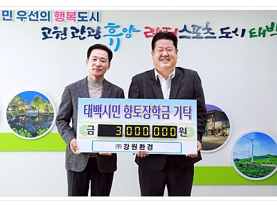 태백시민 향토장학회 통해 지역 학생 꿈 응원... 장학금·고향사랑기부로 이어진 지속적인 지역사랑 실천... 태백시민 향토장학회(이사장 이상호)는 ㈜강원환경(대표 박현주)이 미래인재 양성을 위해 장학금 300만 원을 기탁했다고 밝혔다. 이번 장학금은 지역 학생들이 안정적인 환경에서 학업에 전념하고, 각자의 꿈을 향해 나아갈 수 있도록 지원하기 위해 마련됐다.…