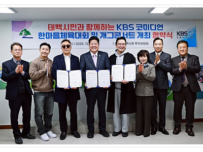 2026~2028년 3년간 시민 참여형 체육대회·개그콘서트 확대 운영... 문화도시 도약 목표로 행정·민간 협력 체계 구축... 태백시가 KBS 코미디언들과 협력해 시민 참여형 문화·체육 행사를 장기적으로 추진하며 문화도시 도약을 본격화했다. 태백시(시장 이상호)는 지난 18일 태백시청에서 KBS 코미디언 극회와 (사)국민화합 강원본부 태백지회와 함께 ‘태…