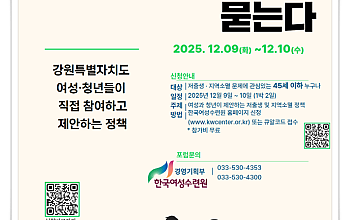 도내 여성·청년 100여 명 참여…정책수요자 관점에서 현실적 대안 제시... 출산·양육 부담부터 청년 유출 대응까지 현장 목소리 기반 정책 논의 확장... 2025년 1월 9일 작성. 강원특별자치도가 심화되는 저출생과 지역소멸 위험에 대응하기 위해 여성과 청년이 직접 정책 해법을 제시하는 포럼을 열었다. 한국여성수련원은 9일부터 10일까지 본원에서 ‘저출생…