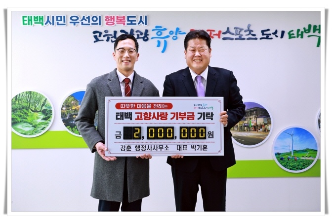 태백시(시장 이상호)는 지난 1월 27일 강훈 행정사무소 박기훈 대표가 태백시청을 방문해 고향사랑기부금 200만 원을 기탁했다고 밝혔다.
