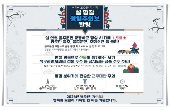 설 명절을 계기로 공직사회 전반의 청렴 의식을 다시 한 번 다지고, 투명하고 공정한 행정 운영을 통해 시민과의 신뢰를 더욱 공고히 한다는 방침이다.