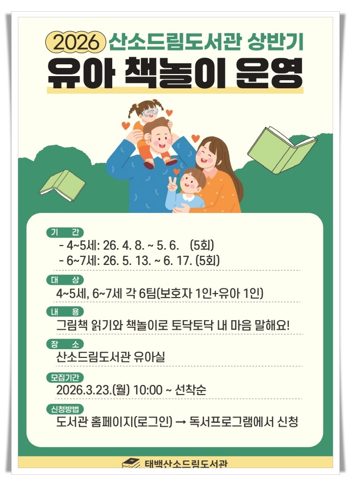 태백시는 산소드림도서관에서 ‘2026년 상반기 유아 책놀이 프로그램’을 운영하고 참가자를 모집한다고 밝혔다.
