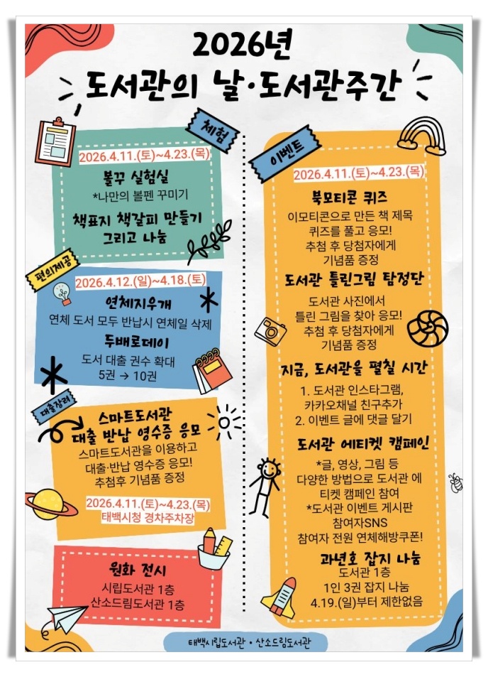 2026년 4월 3일 작성. 태백시가 도서관의 날과 도서관 주간을 맞아 다양한 독서문화 행사를 운영하며 시민 참여 확대에 나섰다.