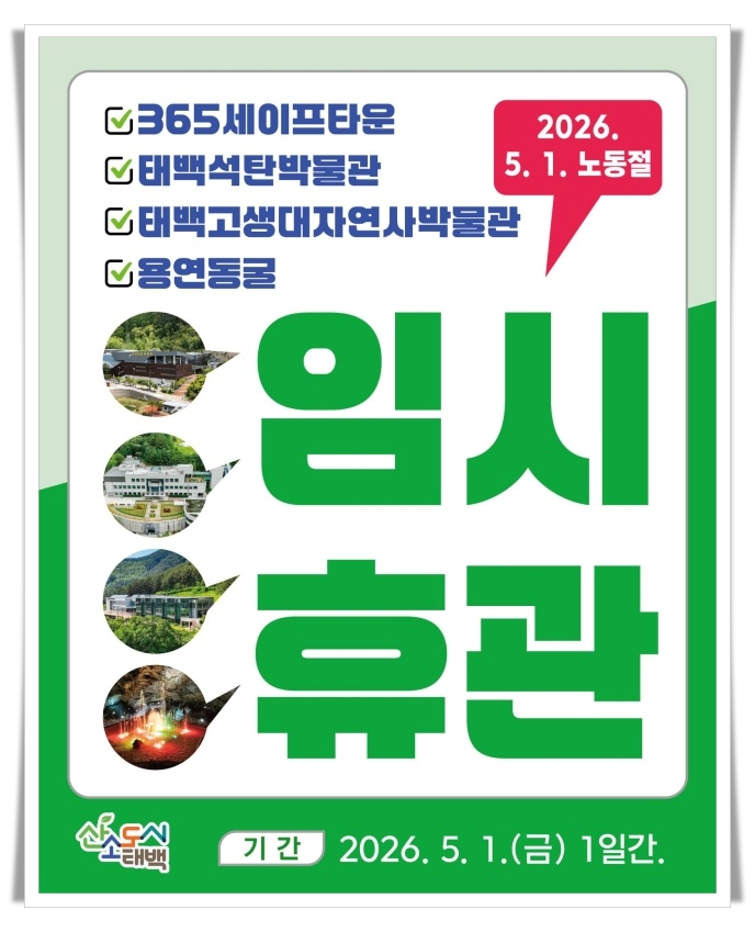 태백시 관계자는 “근로자의 날로 인해 불가피하게 휴관을 실시하게 됐다”며 “시설 점검과 운영 정비를 통해 보다 안전하고 쾌적한 환경을 제공하겠다”고 밝혔다.