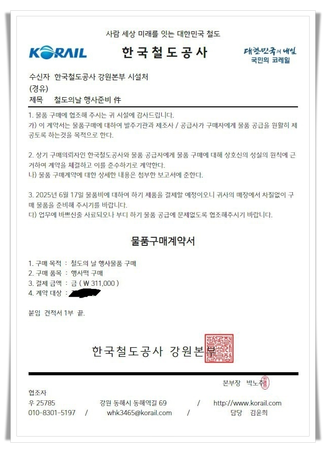 한국철도공사 강원본부는 최근 전국적으로 확산되고 있는 공공기관 사칭 물품구매 사기와 유사한 사건이 강원 지역에서도 발생했다며 시민들의 각별한 주의를 당부했다.